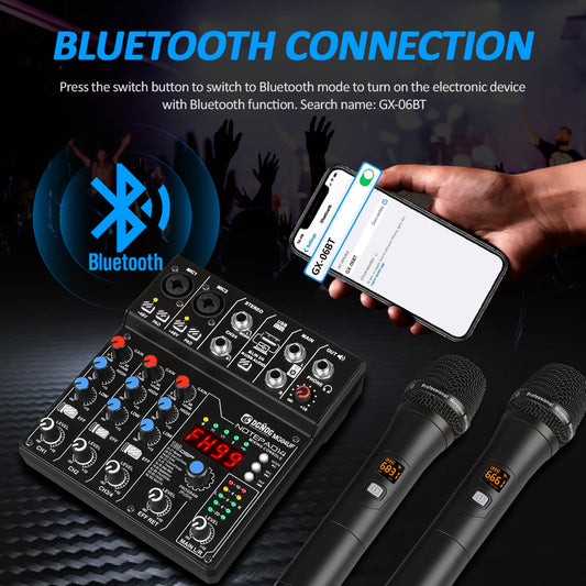 DGNOG 4 Channel Audio Mixer with UHF Wireless Microphone USB/Bluetooth Function 99DSP Effect PC Recording DJ Console for Home Karaoke