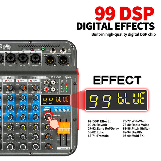 DGNOG Audio Mixer RE-4 PRO 4-channel 99 DSP Effects Professional With Bluetooth USB Interface for Family Parties Music Lover