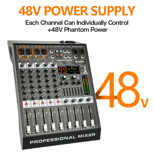 DGNOG PMX06 6 Channel Mixer 99 DSP Digital MP3 Input 48V Phantom Power Supply 7-stage Equalizer Podcast Recording with Bluetooth