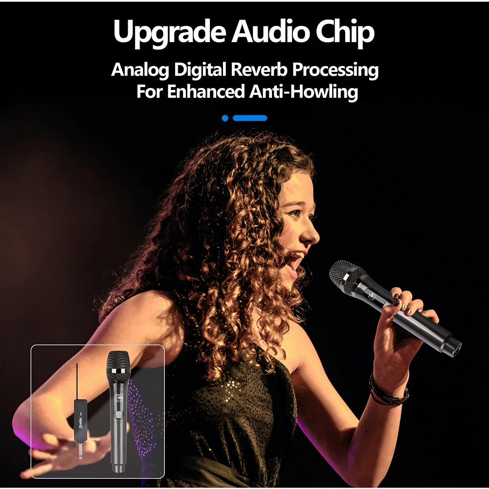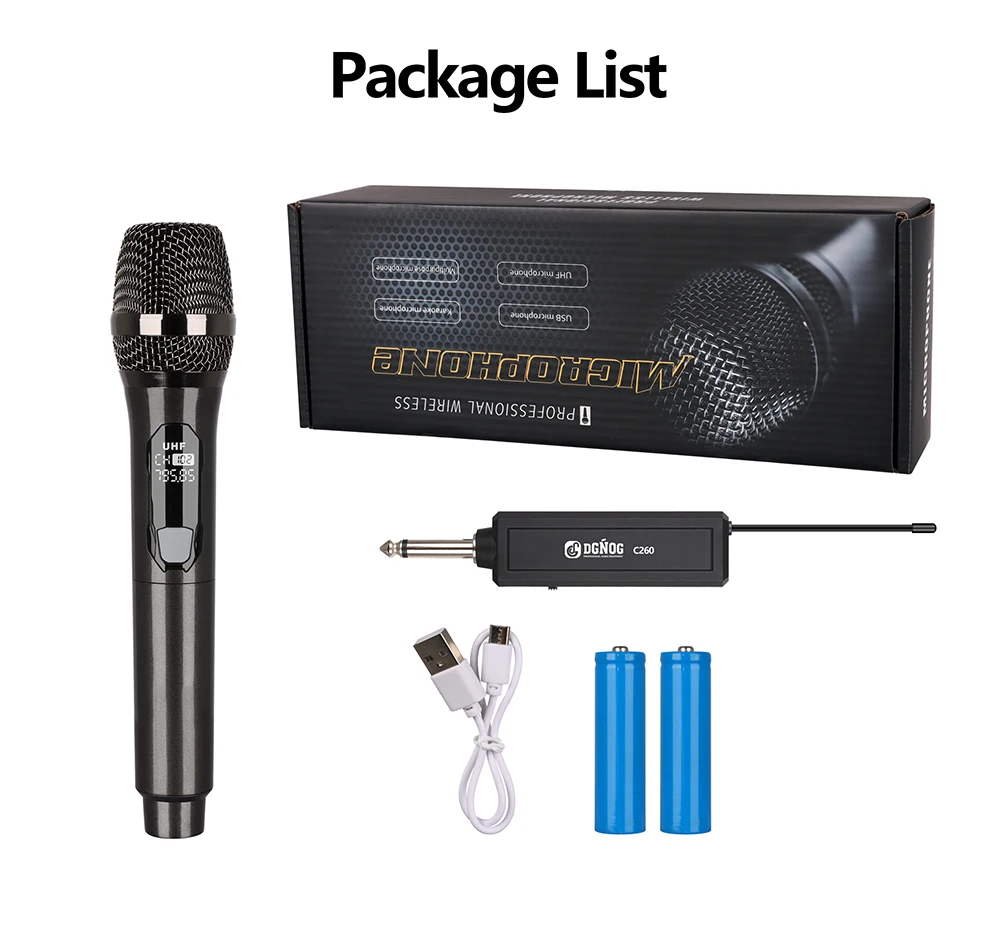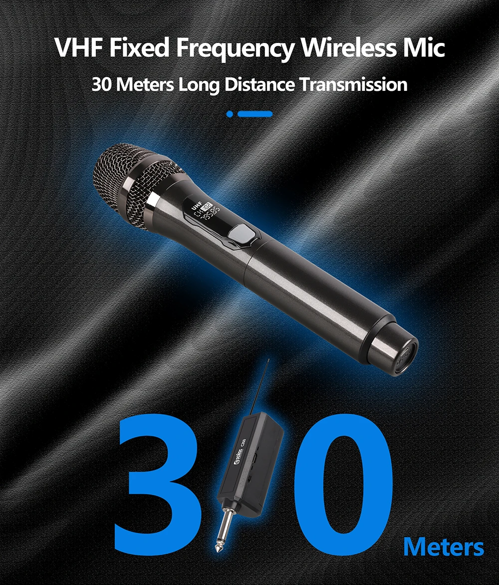 ♬【C260 Wireless Microphone】--- Built-in high sensitivity professional Dynamic VHF microphone, for greater gain while simultaneously minimizing background feedback (Signal stability, No radiation, Anti-howling, Anti-jamming, fixed frequency, Distortion <0.2%), transmission distance close to 30 meters. Perfect for karaoke machine, presentation, wedding, conference, church, interview, and family party.