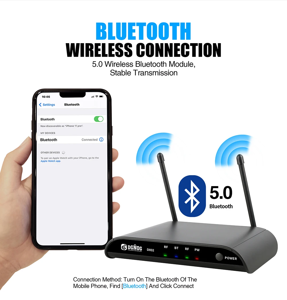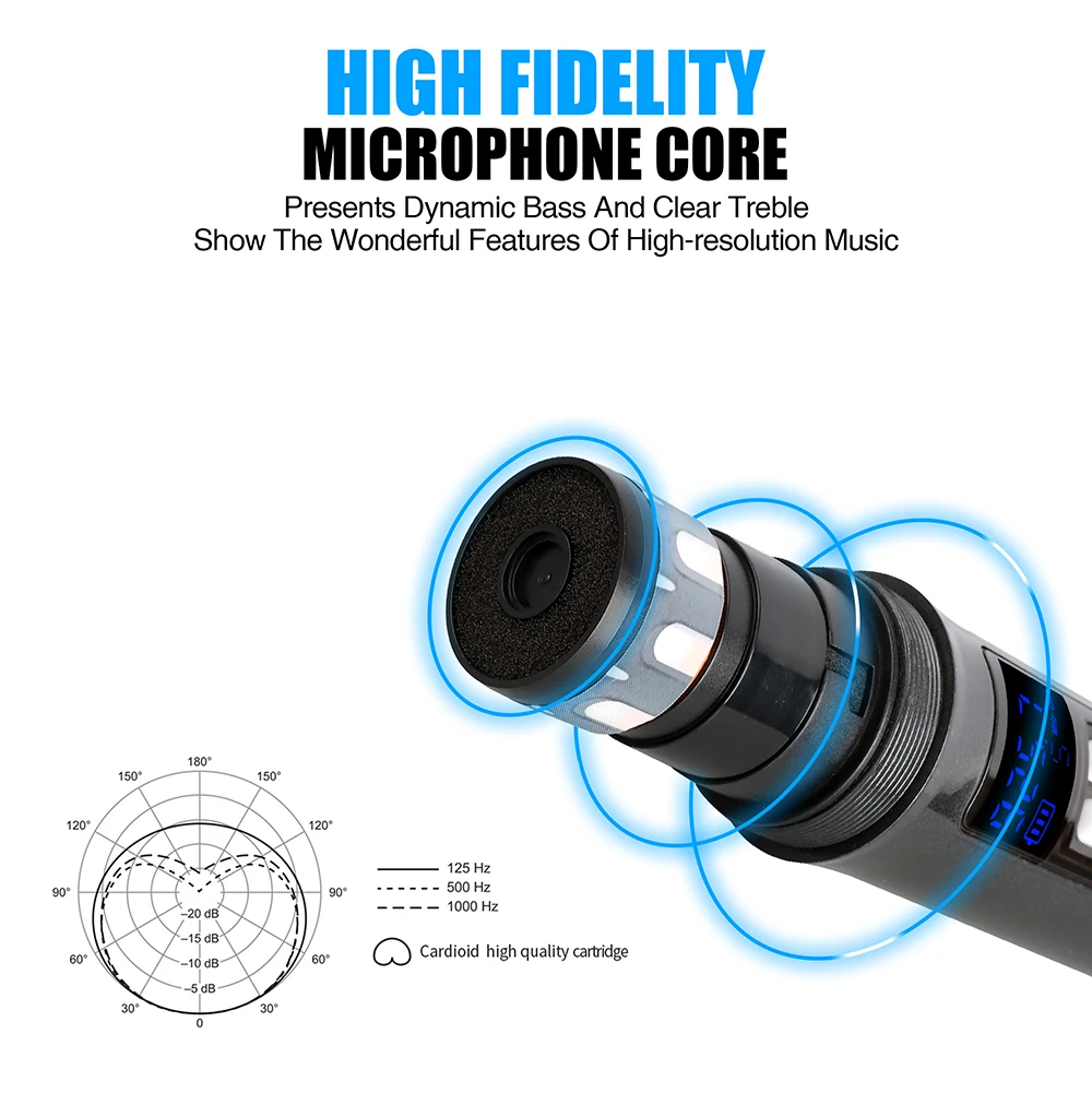 [Wireless Microphone System With Echo/High/Bass] : The karaoke microphone set has Echo, High, Bass control button, so you can choose different sound effects according to different songs. This wireless microphone system has Bluetooth function, connect via Bluetooth( Bietrun 08) to play your favorite music.This wireless microphone has 30 channels, each 15, you can switch to the channel that do not have interference. Perfect for Karaoke, Speech, Meeting, Conference, Indoor or Outdoor.