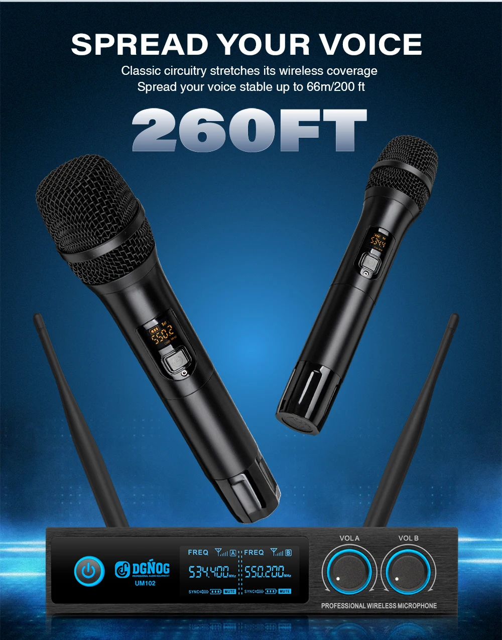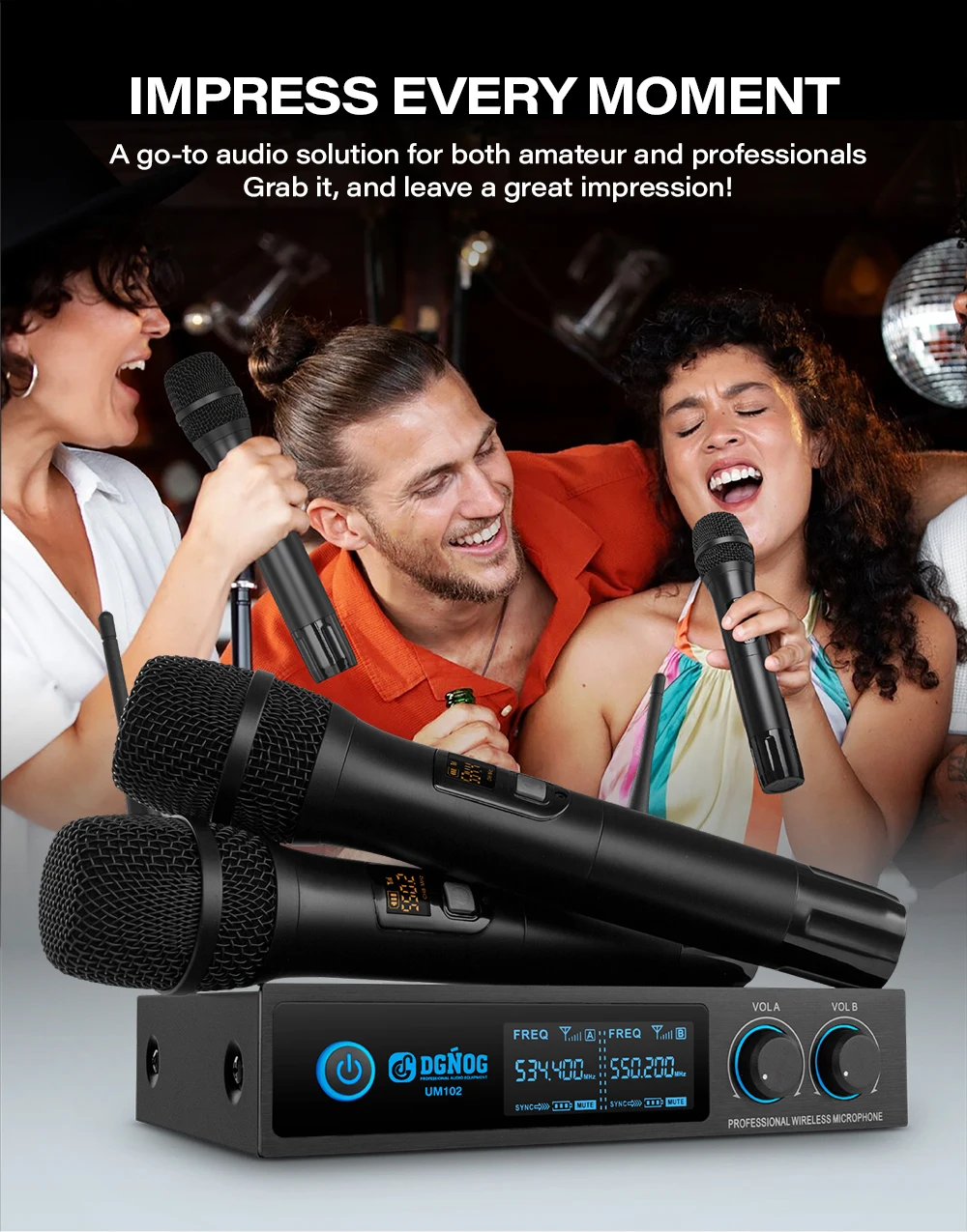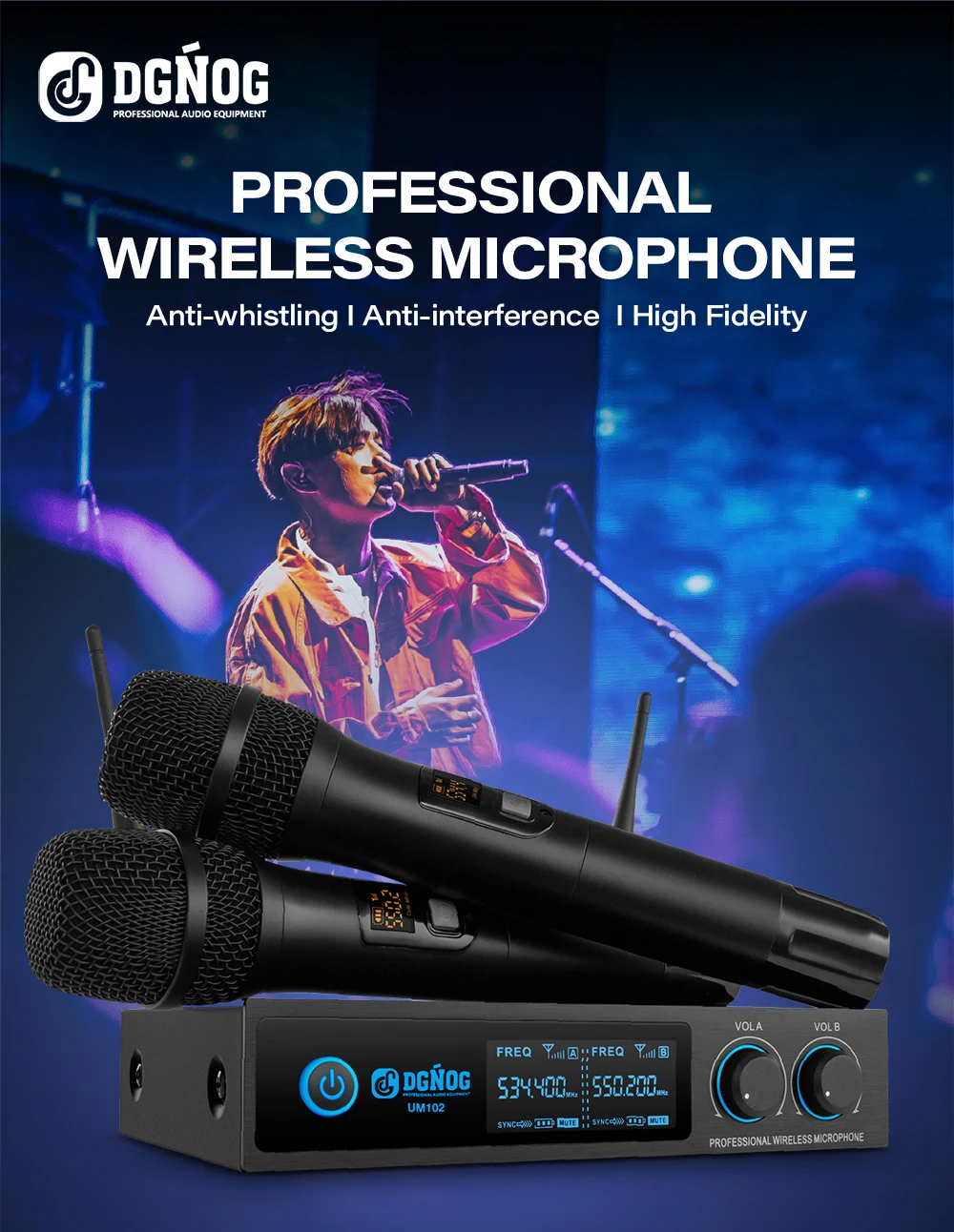 DGNOG UM102 UHF Wireless Microphone Adjustable Frequency Dual Handheld Microphone Full Metal Suitable for Church Singing Karaoke