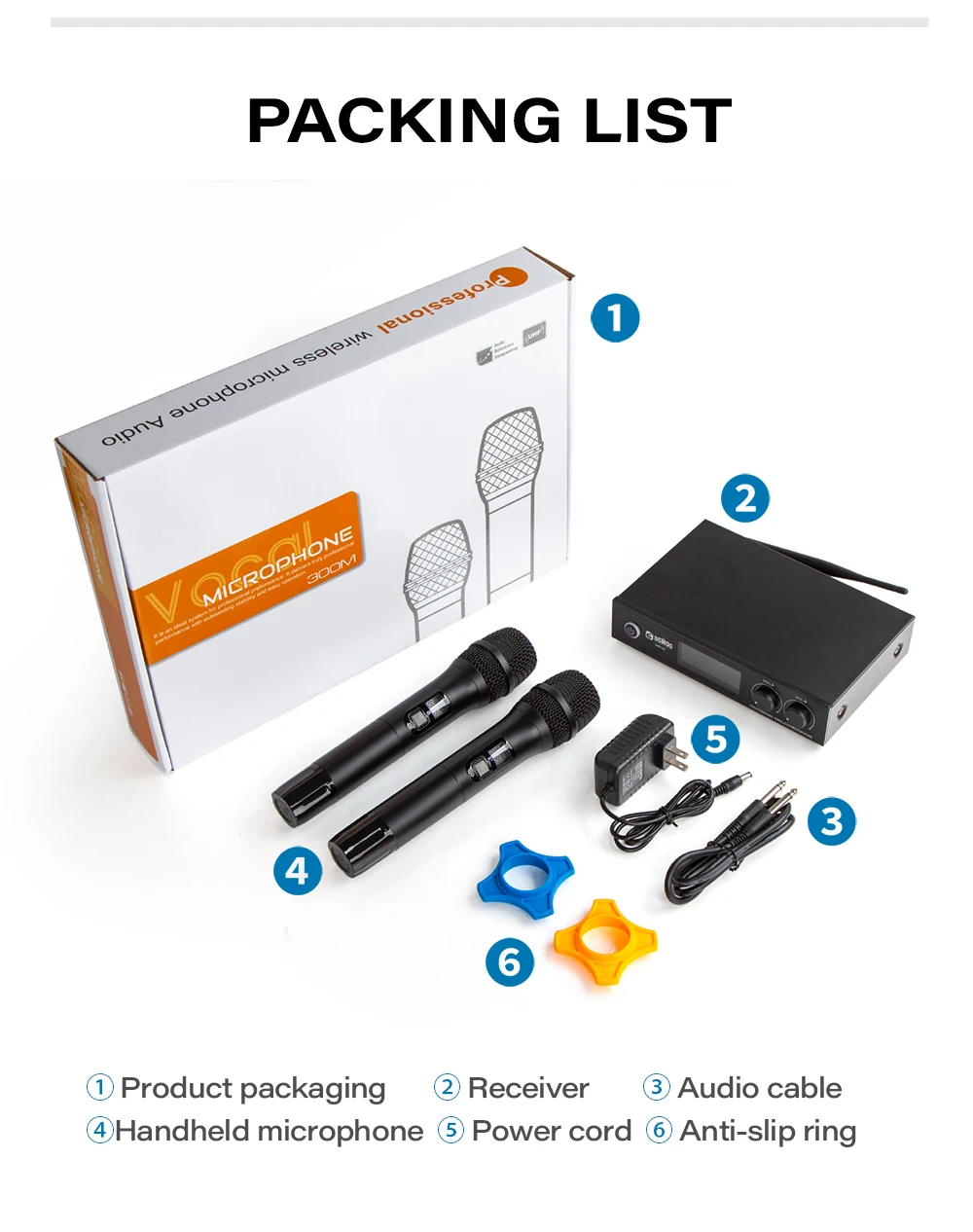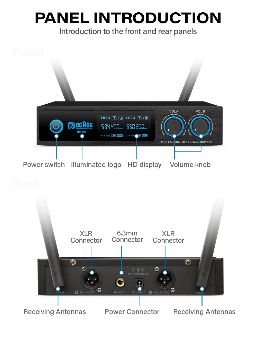 【Package Includes】- 2 x UHF wireless microphones, 1 x UHF wireless receiver, 2 x anti-slip rings, 1 x 6.35mm audio cable, 1 x power cable, and 1 x User manual. DEVOTED SERVICE: DGNOG offers dedicated customer support. Contact us for any troubleshooting or replacement needs.