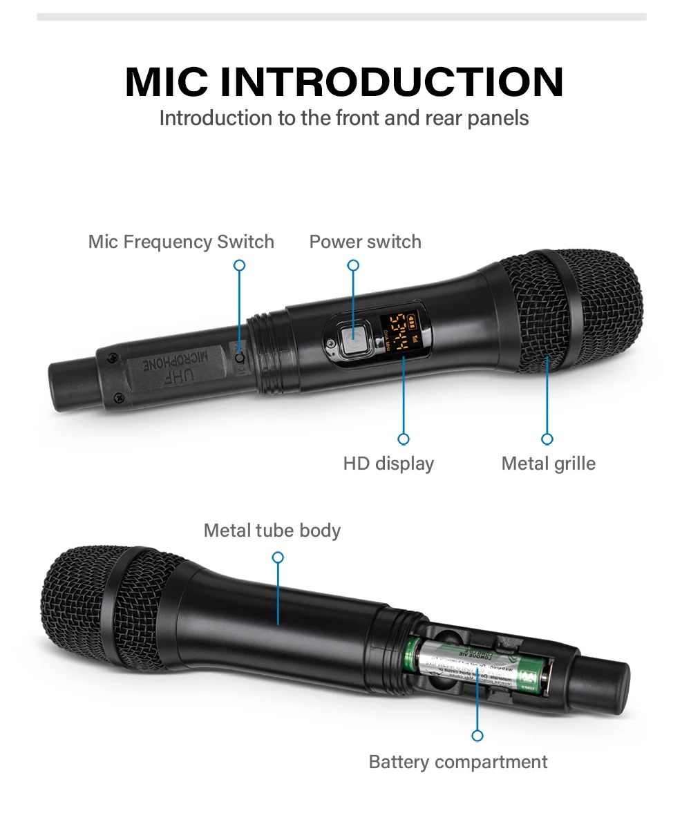【Easy to Use】 - The wireless microphones and receiver will automatically pair when turned on. Each wireless microphone has a separate volume control (VOL.A & VOL.B) for more versatile occasions. Please note that 2 x AA batteries (not included) are required for each mic.